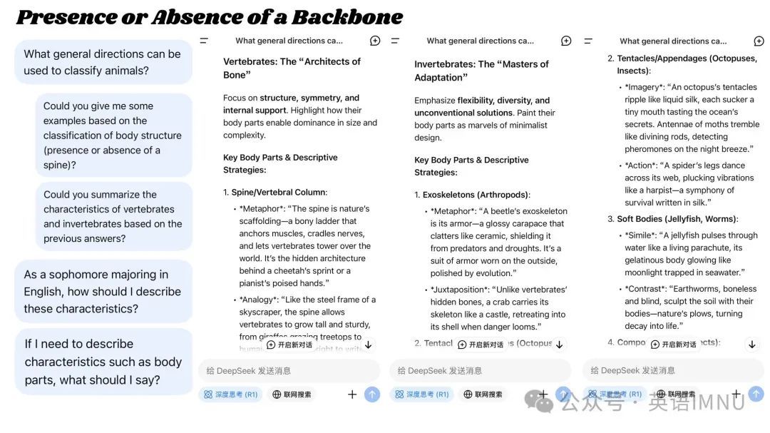 围绕《新交际英语综合教程》“Animals”单元,张老师让学生先集体讨论预习要点,再借助DeepSeek深度预习并记录互动过程。成果展示时,学生汇报思路,老师引导分析差异。