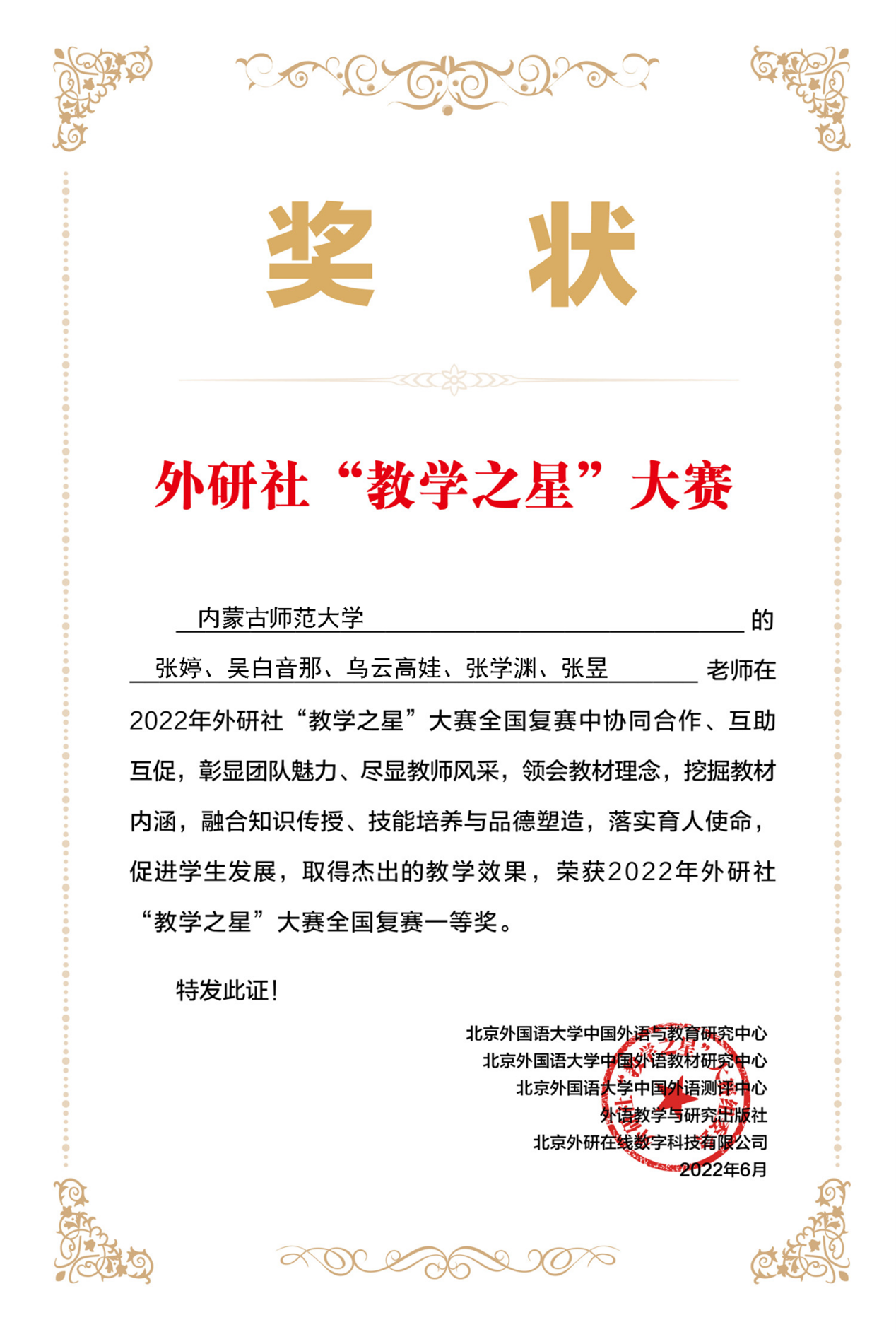 近日,sunbet官网sunbet申搏官方网站英语系教学团队在2022年外研社“教学之星”大赛全国复赛中再获佳绩。本次参赛团队由张婷、吴白音那、乌云高娃、张学渊、张昱五位老师组成,团队充分发挥集体智慧,群策群力,厚积薄发,在比赛中荣获全国复赛英语专业组一等奖,这也是“教学之星”大赛改为团队赛制后,英语系教师团队连续第二年在本项赛事中荣获佳绩。