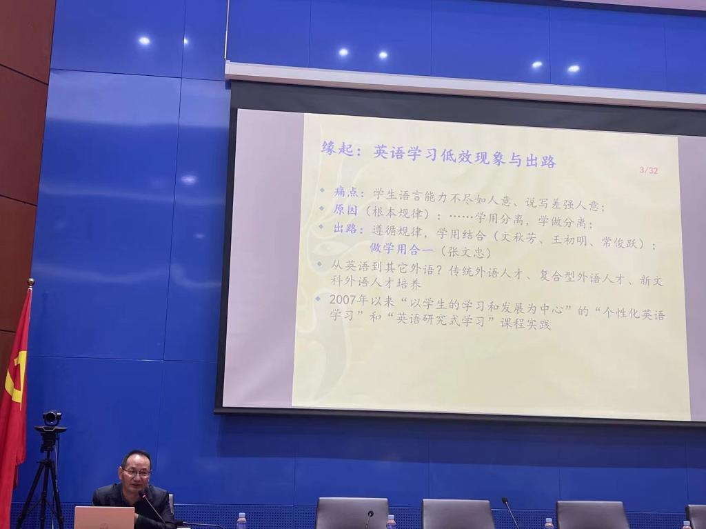 在《赋权增能型外语教育理路》一讲中,师生们了解到,赋权增能型外语教学是张文忠教授独创的针对英语学习“费时低效”现象的外语教学理路。 “赋权”是起点和手段,“增能”是目标。赋权的维度包括角色的赋权、学习内容的赋权、学习方式的赋权、课堂组织的赋权以及学习评价的赋权。赋权后,学生从知识的吸收者逐步转变为意义的建构者、知识的发现者和应用者,评价方式从“以教师评价为主”逐步转变为“教师评价与学生评价相结合”。增能从赋权开始,教师的教学内容不仅要“授之以鱼”,更要“授之以渔”,着重提升学生的外语运用能力、文学赏析能力、跨文化能力、思辨能力、创新能力、信息技术应用能力、自主学习能力和实践能力,实现角色权利责任统一、做学用合一、能力内生的目标。