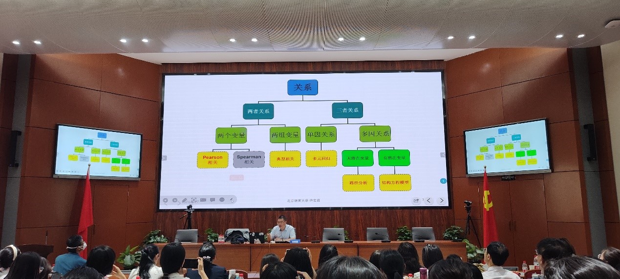 5月27日,北京语言大学许宏晨教授带来题为“量化研究方法与论文写作”的研修讲座。许教授从文献的阅读与评价入手,结合具体论文实例,深入浅出地讲解了阅读与评价实证研究论文的惯例思路、要领和技巧。随后,许教授分享了量化研究选题策略与量化研究设计思路。以教育语言学为例,许教授提炼出五条选题策略:了解学科概貌、锁定研究领域、聚焦研究话题、拓展相关知识和关注国家大事。在量化研究设计环节,许教授重点阐明了量化研究设计与统计的关系,详细讲解了统计分析的类型、选择条件和不同功能,并慷慨分享了统计方法方面宝贵的学习资源。以《外语教育研究前沿》为例,许教授还对学术期刊投稿流程、注意事项等进行了细致的讲解。讲座最后,许教授与研修学员进行了亲切互动,对与会师生提出的问题进行了耐心、细致的解答。