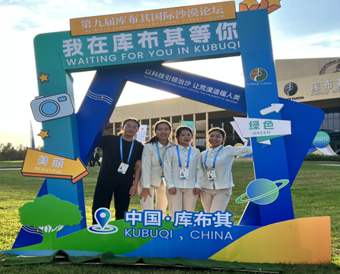 2023年8月23日至8月27日,sunbet申搏官方网站翻译硕士学位点(英语)主任那日苏、英语系教师徐雅婧带领学位点22级英语口译方向研究生参与了第九届库布其国际沙漠论坛志愿服务工作。本届论坛主题为“以科技引领治沙 让荒漠造福人类”,旨在推动国内外荒漠化防治与生态文明建设科技创新交流合作,传播我国防沙治沙科技创新经验成果,助力构建人类命运共同体。来自国内外约300位政商人士、专家学者受邀出席。