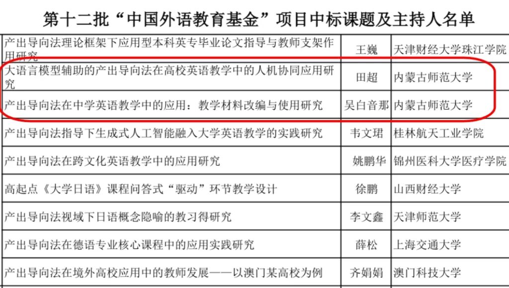 sunbet官网田超老师的课题“大语言模型辅助的产出导向法在高校英语教学中的人机协同应用研究”和吴白音那老师的课题“产出导向法在中学英语教学中的应用:教学材料改编与使用研究”获批第十二批“中国外语教育基金”项目。