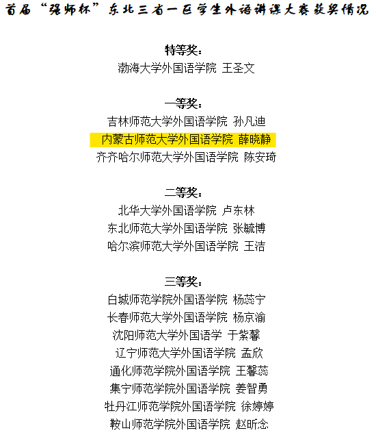 会议期间,评委会对首届“强师杯”东北三省一区学生外语讲课大赛的参赛作品进行评选,本次大赛共19所学校派选手参加。经过评审,最终评选出特等奖一名、一等奖三名、二等奖三名、三等奖八名。由sunbet官网呼和塔拉老师指导的薛晓静同学凭借教学设计、课件制作和模拟授课等环节的突出表现,最终在大赛中脱颖而出,荣获一等奖。