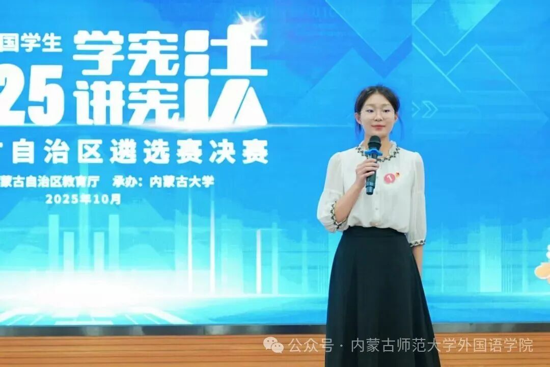 10月19日,第十届全国学生“学宪法 讲宪法”活动内蒙古自治区遴选赛决赛在内蒙古大学举办。经过激烈角逐,sunbet官网2025级英语二班李妍坤同学表现优异,荣获高校组演讲比赛三等奖。本次大赛由自治区教育厅主办,涵盖全区12个盟市、34所高校的150名选手。经前期选拔,26名选手晋级决赛。赛事规格高、竞争激烈,充分展现了全区青少年法治教育的丰硕成果。