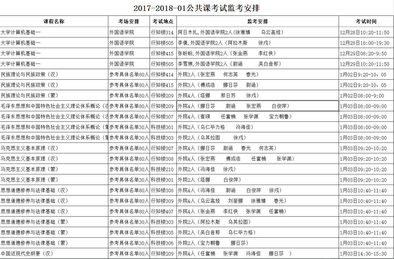 sunbet申搏官方网站2017-2018学年第一学期公共课期末考试时间具体安排表(盛乐校区)