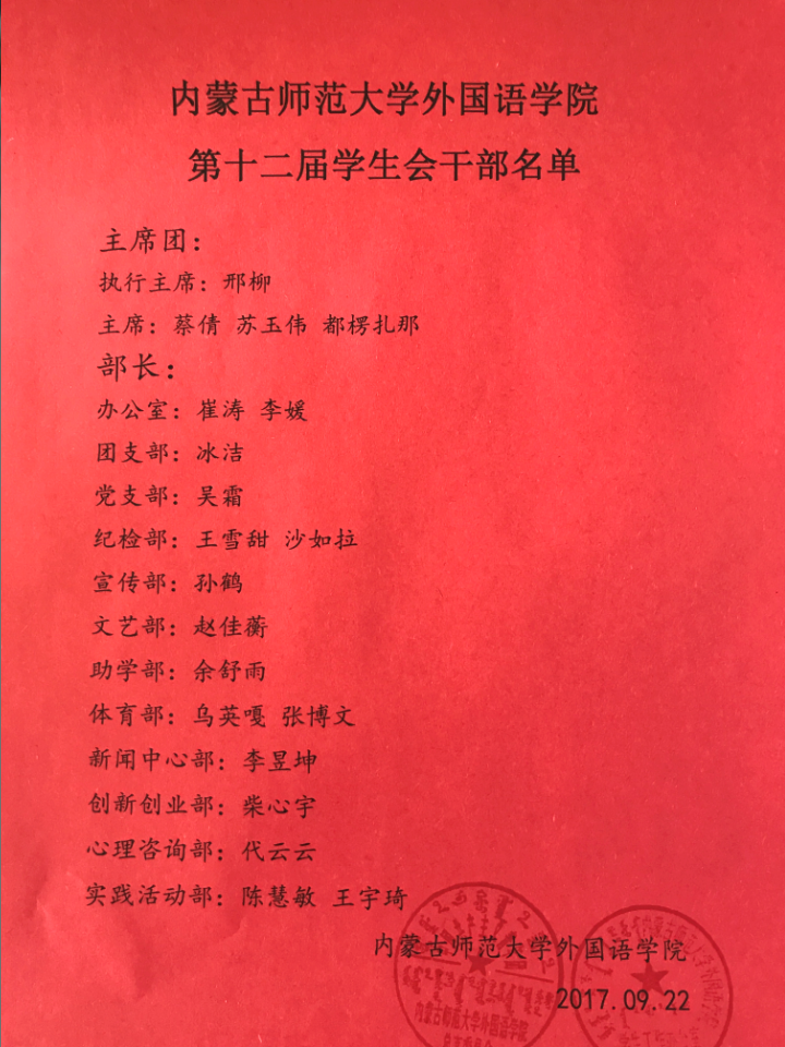 sunbet申搏官方网站第十二届学生会主席团及各部长名单公示