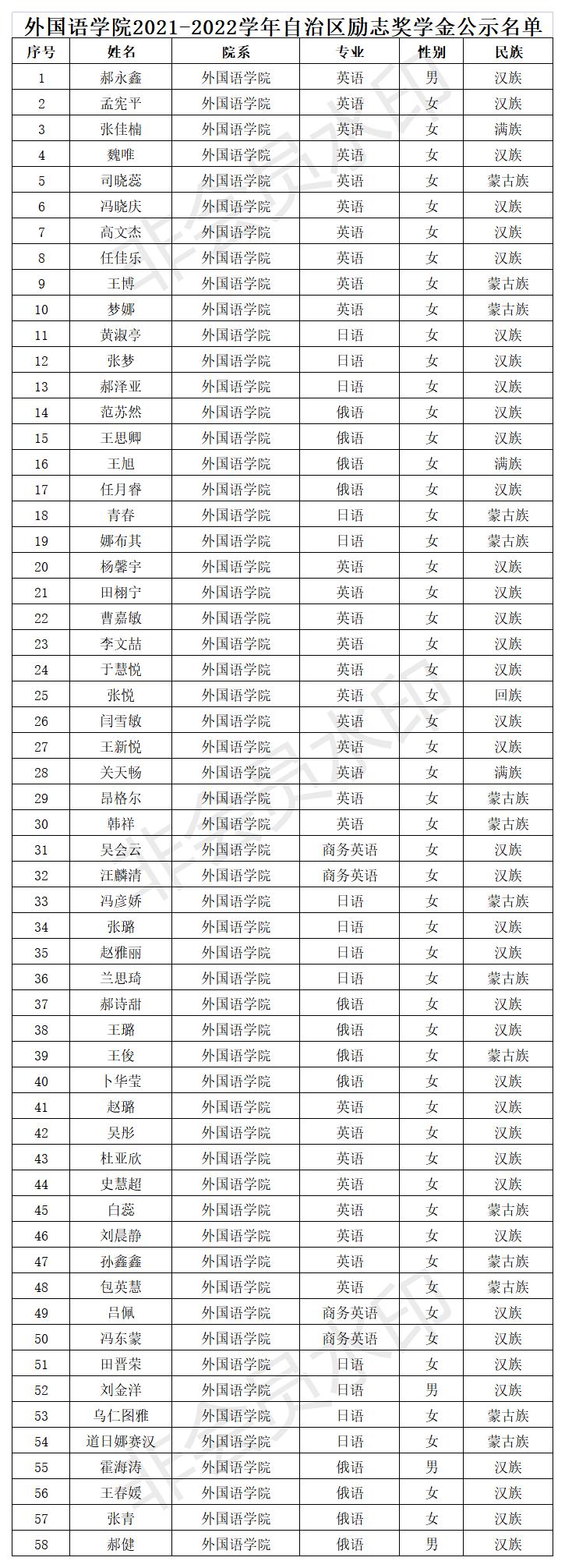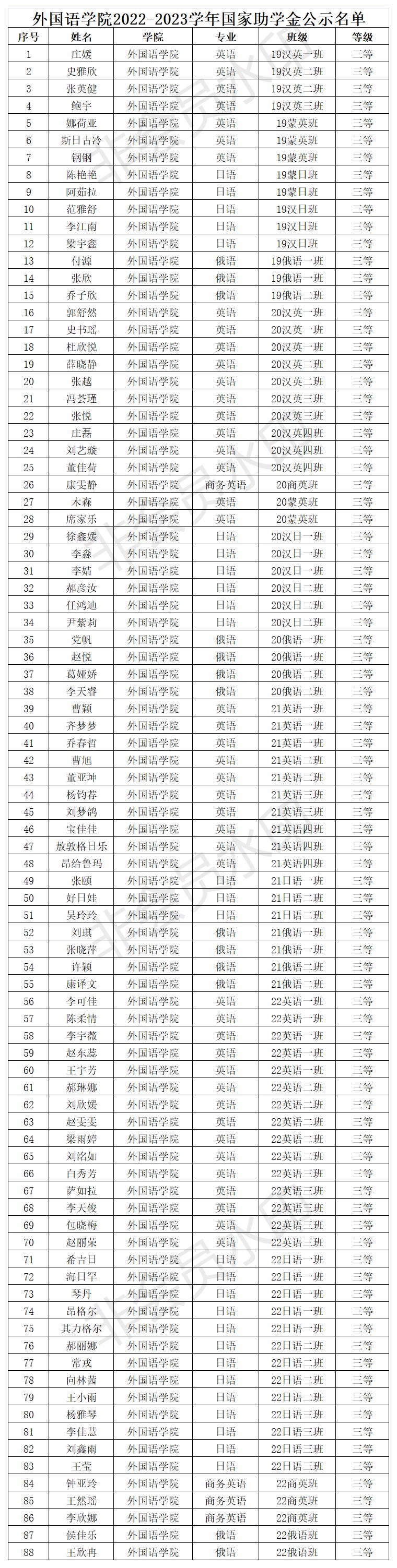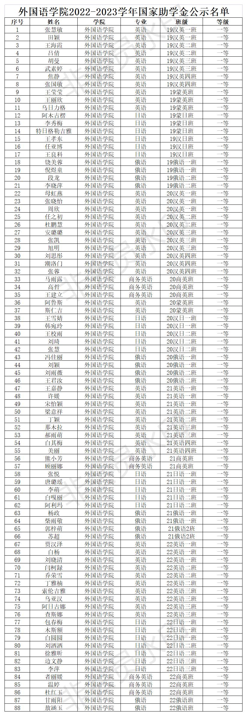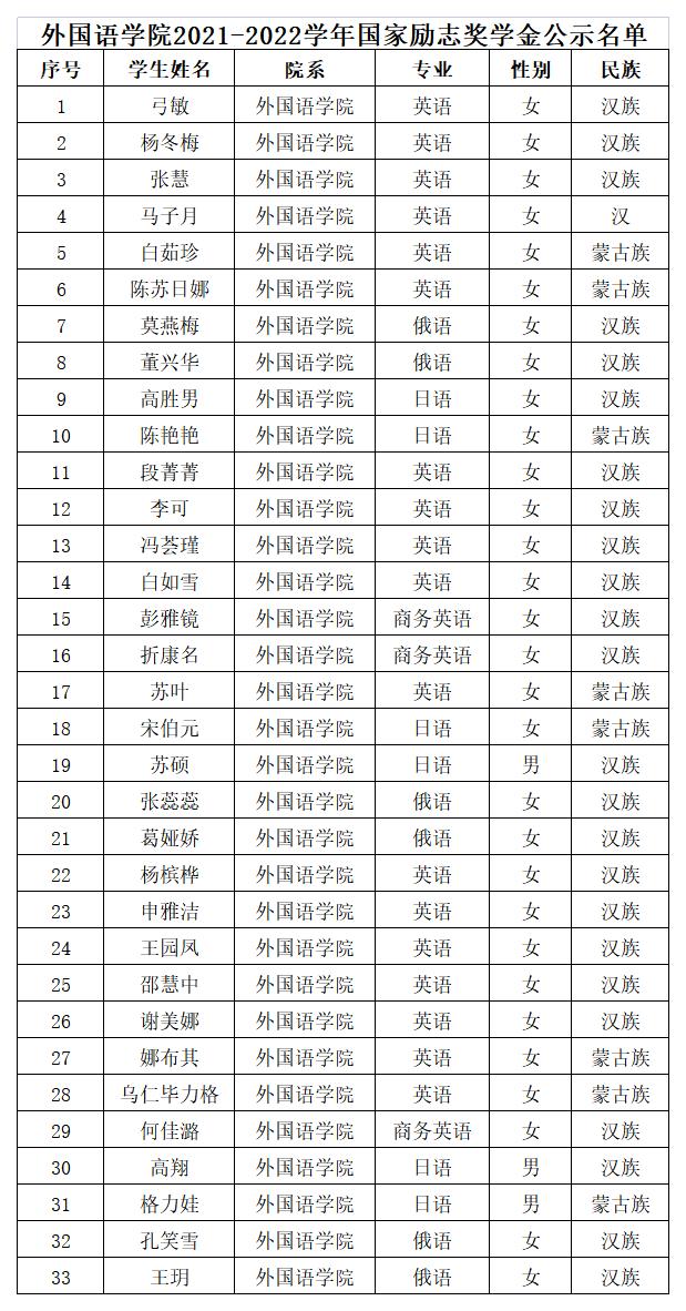 根据关于印发《sunbet申搏官方网站国家励志奖学金、国家助学金评选管理暂行办法》的通知(校发〔2015〕73号),《关于印发<sunbet申搏官方网站自治区励志奖学金评选暂行办法>的通知》(内师校发〔2021〕66 号),《关于开展 2021-2022 学年自治区励志奖学金评审工作的通知》(校学发〔2022〕19 号),以及《关于开展 2021-2022 学年国家励志奖学金、2022-2023 学年国家助学金评审工作的通知》(校学发〔2022〕17 号)等文件精神,sunbet官网组织开展了评选工作。经学生本人申请、班级评审小组审核、班主任审核、学院评审委员会评选,最终确定拟推荐人选名单(国家励志奖学金33人,自治区励志奖学金58人,国家助学金一等88人、二等137人、三等88人)。为体现公开、公平、公正的原则,现将拟推荐名单予以公示3天。如有异议,请来电或来信反映。