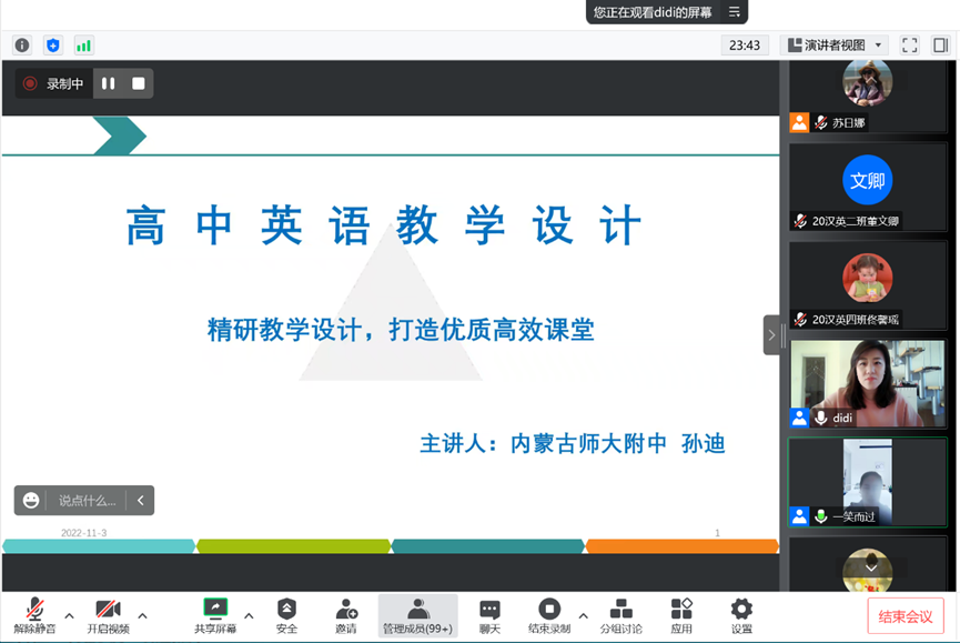 11月3日下午,sunbet申搏官方网站附属中学孙迪老师主讲第二场讲座,题目为《高中英语教学设计——精研教学设计,打造优质高效课堂》,讲座由英语系何志英老师主持,英语系教师教育团队教师、 2020级全体本科生以及部分研究生聆听了讲座。