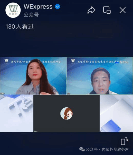 外教社思飞学院“全国高校高质量课程虚拟教研室”以课程类型为核心,每周定期邀请全国优秀教学团队和教师,以教学示范课的形式,举办线上直播讲座,响应国家教育数字化战略,探索和实践外语教学模式的创新,助力提升高校外语教师的教学设计能力,优化智慧教学环境,加强课程体系建设,推动优质教育资源的开放与共享。