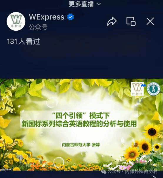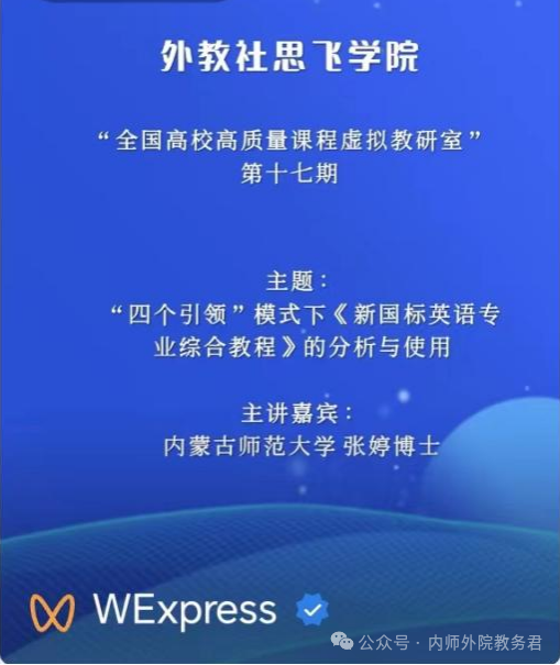 9月28日,sunbet官网英语系《综合英语》课程团队受上海外语教育出版社思飞学院的邀请,在“全国高校高质量课程虚拟教研室”(第十七期)做教学创新经验分享,张婷博士作为团队代表担任主讲嘉宾,通过WExpress视频号直播平台以《“四个引领”模式下新国标英语专业综合教程的分析与使用》为题做教学创新实践经验分享,sunbet官网英语系全体教师和来自全国各地高校500余名教师在线观看了直播。