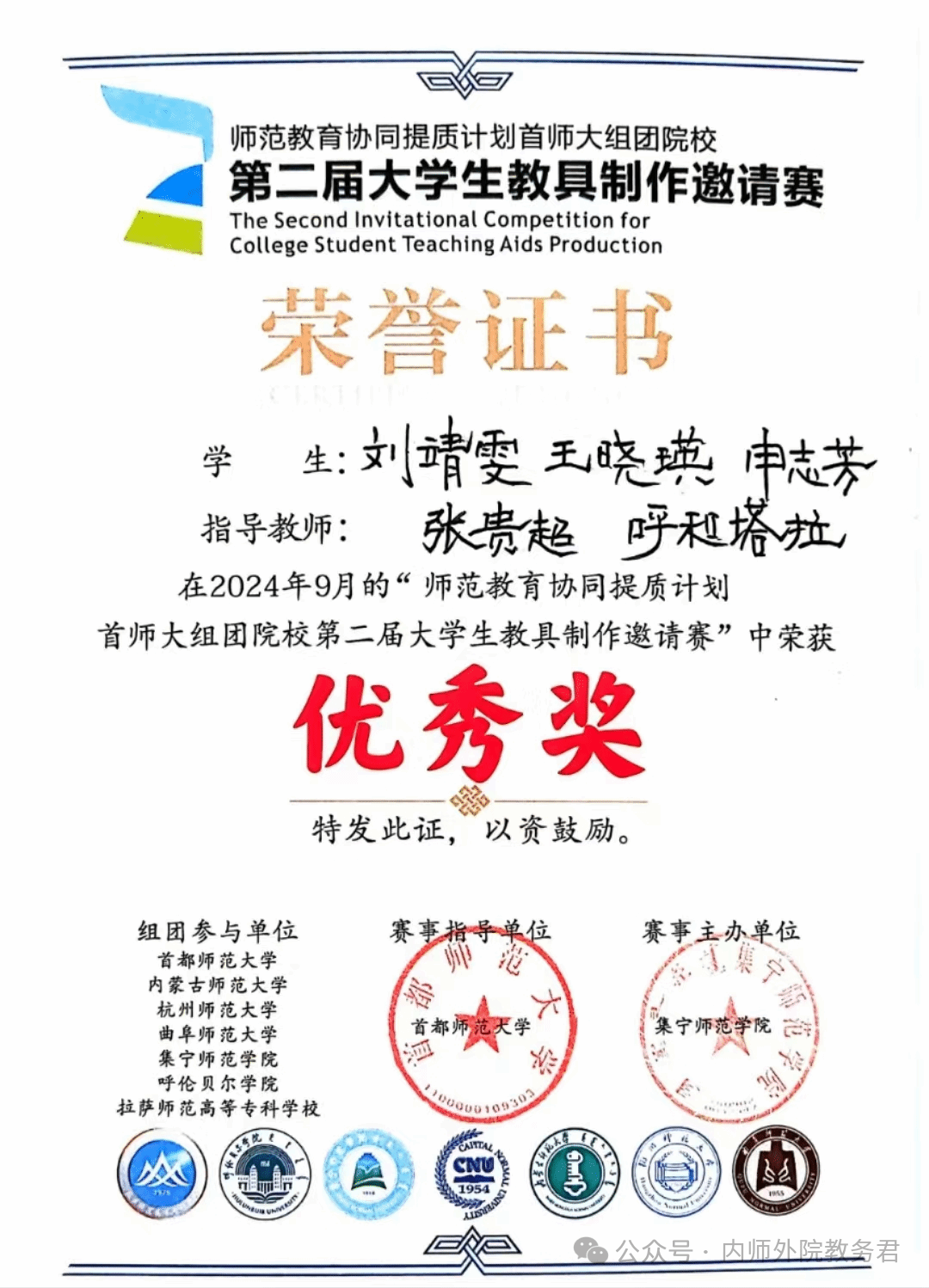 在刚刚落幕的“师范教育协同提质计划首师大团组院校第二届大学生教具制作邀请赛”中,代表sunbet申搏官方网站参赛的22级英语一班的刘靖雯、王晓瑛、申志芳三位同学在复赛中充分展示了外院学子的良好风貌,作品“游转大世界”获得优秀奖。