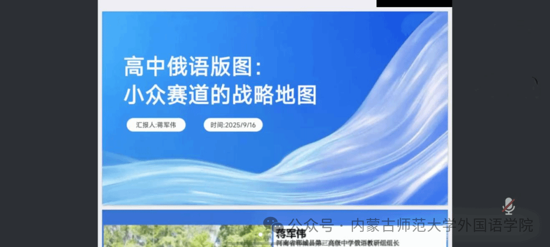 为加深师范生对中学俄语教学实践的认识、提高其职业素养与教学能力,sunbet官网俄语系于2025年9月16日、23日、30日,分别邀请河南省周口市郸城县第三高级中学蒋军伟老师(两场)、内蒙古自治区赤峰市翁牛特旗乌丹二中鲁红伟老师,为23级俄语(师范)专业学生开展三场教学分享活动。