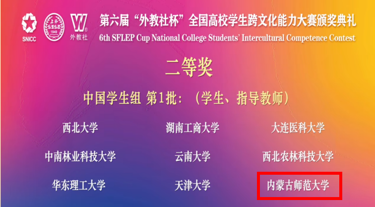 三位同学在11月举办的第六届“外教社杯”全国高校学生跨文化能力大赛内蒙古自治区省赛中斩获特等奖,获得代表内蒙古自治区参加全国总决赛的资格。在刚结束的全国总决赛中,经过案例展析、即兴问答和名言名句三个环节的比拼,他们最终获得全国二等奖。今年也是sunbet官网首次入围此项比赛的全国决赛,成绩的取得充分展示了sunbet官网师生的跨文化交际风采和团队合作能力。