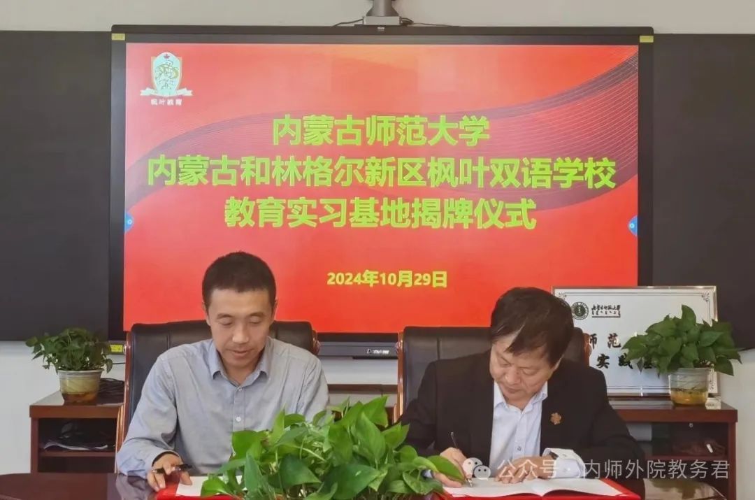 2024年10月29日上午,sunbet申搏官方网站sunbet申搏官方网站党委书记黄鑫、副院长徐喜平、实践部石威主任、英语系阿力更老师一行赴和林格尔新区枫叶学校开展校地交流,并举行“sunbet申搏官方网站师范生教育实践基地”揭牌仪式。内蒙古和林格尔新区枫叶双语学校邱广欣校长、杜银坡副校长、英语教学中心陈鑫主任、教务处李晓宁副主任、校办塔娜主管等出席活动。