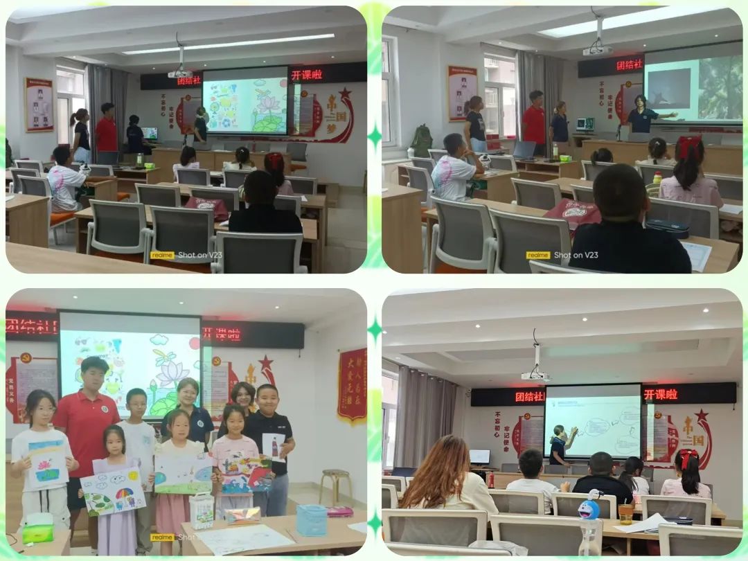 假期多数孩子留了制作手抄报的作业,炎炎夏日里志愿者们以夏天作为主题,引导孩子们布局手抄报版面,在趣味作画的同时完成了部分作业。